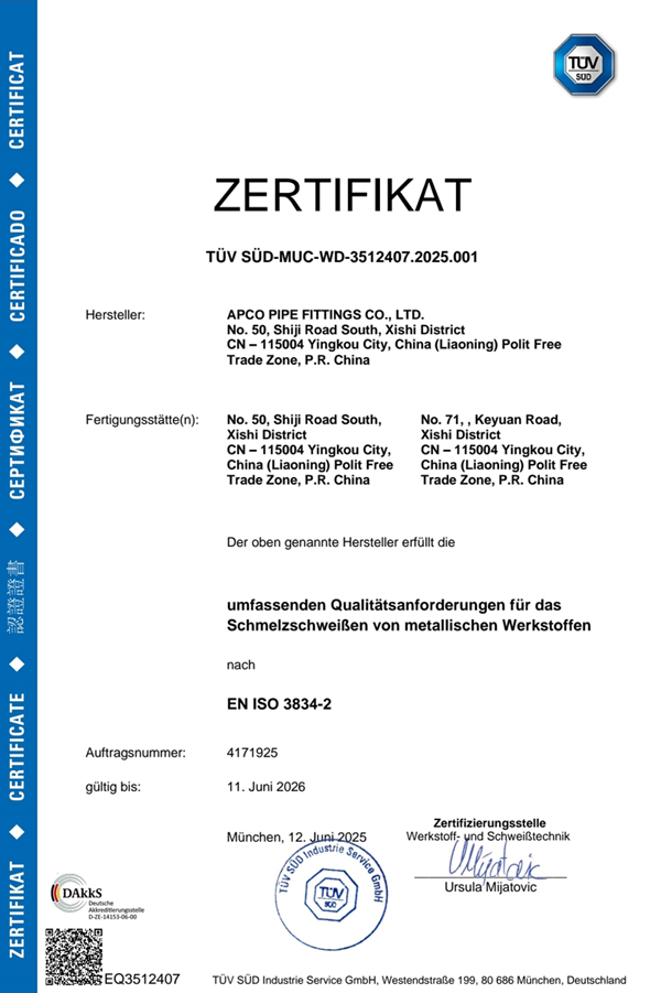 APCO's Welding Fittings are manufactured in compliance with the following applicable standards:ANSIB16.9,ANSIB16.28 / ASTM A234,ASTM A403,ASTM A420,ASTM A860 / MSS-SP43,MSS-SP75 / WPHY42,WPHY52 ,WPHY60,WPHY65,WPHY70 / JIS B2311,JIS B2312,JIS B2313 / DIN2605,DIN2606,DIN2616,DIN2615